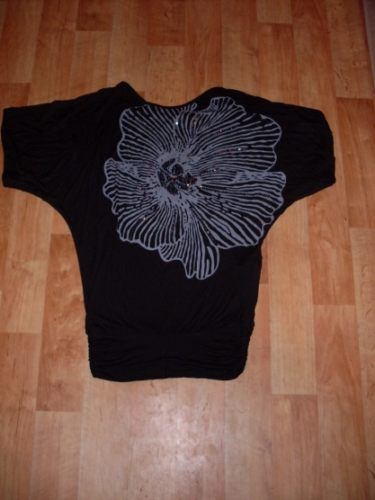 Prodám minimálně nošenou černou tuniku na jedno rameno, s motivem květiny a s flitry.