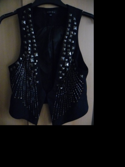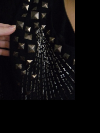 Perfektní stav. Barva je něco mezi černou a tmavě modrou. Velikost uvedena 38, ale padne S i M. Dle mého nechybí ani jeden korálek ani pyramidka. Zapínání na háček. Saténová podšívka. Materiál:65% polyester, 35% viskóza.