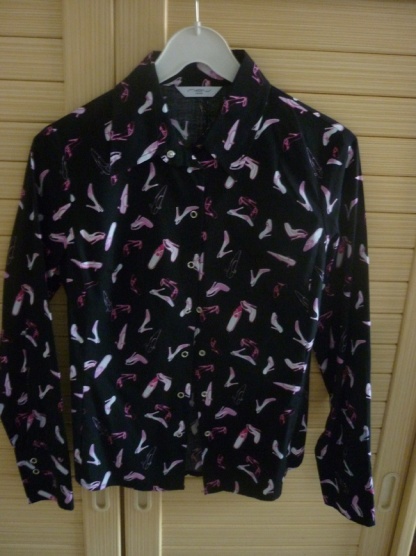 Prodám tuto černou košili s dlouhým rukávem na zapínání. Na košili je spoustu růžových bot. Nikdy nenošená. Velikost není uvedena, ale doporučila bych na velikost S. Cena 30Kč