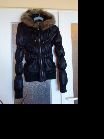 Prodám černou zimní bundu s kapucí s kožíškem, který lze odepnout, kapuce je napevno. Je nošená, stav tomu odpovídá (na rukávu je maličká dírka), ale pořád je pěkná. Kolem pasu a rukávů jsou úplety.