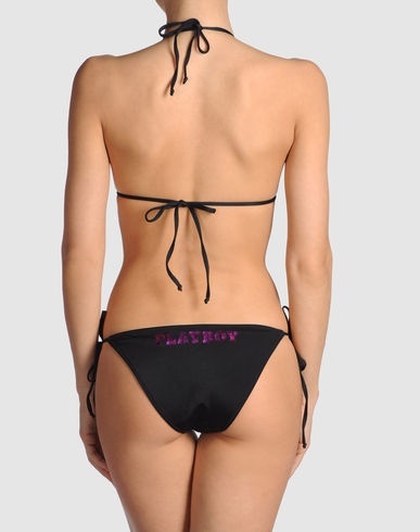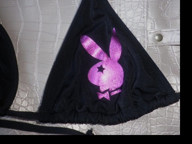 Nové černé bikiny Playboy, na horním dílu plavek je metalicky vínový potisk zajíčka a na zadní části kalhotek je nápis "Playboy", vel. M, dá se upravovat díky šňůrkám. Nové, originál, s visačkou.