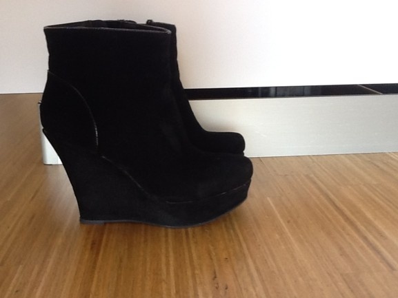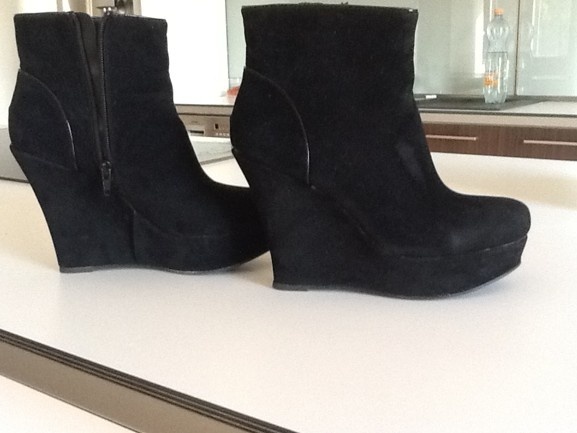 Prodám černé klínky z Deichmannu kolekce catwalk.Uvnitř jemný kožíšek.Úžasně prodlužují nohy.Včera mi došly,ale špatně se mi v nich pro platformu řídí a to já nemohu mít,jelikož jsem v autě stále,tak je prodávám dál.Jinak jsou moc pohodlné a lehounké i přes vysoký klínek 10cm.Na fotce jde vidět škrábanec,jinak jsou psané prodejkyní,že jsou téměř nenošené.Kolem platformy jde vidět lepidlo.Za tuto cenu,určitě udělají parádu.