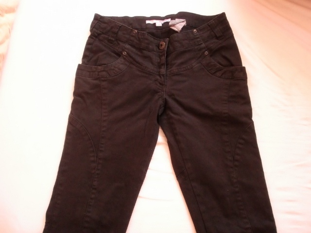 0Zachovalé, zvláštní prošívání, na nohavicích ze zadu malý zip. Kdysi měly vzadu u kapes malý řetízek, ale někde se utrhnul. Cena 200 Kč + pošta.
