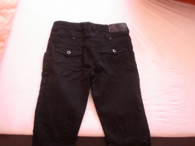 Zachovalé, zvláštní prošívání, na nohavicích ze zadu malý zip. Kdysi měly vzadu u kapes malý řetízek, ale někde se utrhnul. Cena 200 Kč + pošta.