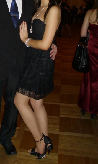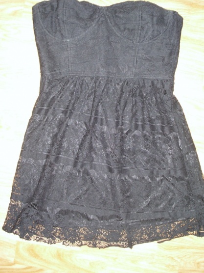 Skoro nové šaty, které byly jednou vzaté na ples. Jsou z lehkého černého materiálu, který je pošitý elastickou černou krajkou. U hrudníku je speciální střih pro poprsí, vycpaný však není. Doporučuji pro ženy, které nemají tak objemný hrudník nebo plnější ňadra.