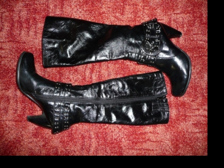 Prodám černé lesklé kozačky se sponou, nošené,ale výborný stav, jen byly poškrábané podpatky do výšky cca 2cm,ale zatřela jsem černým lakem,takže to absolutně na noze není poznat, vše viz foto. Kozačky jsou lesklejší, nikoliv lakované, na fotu s bleskem se lesknou více než reálně.