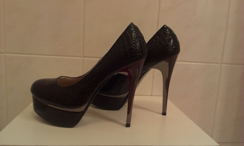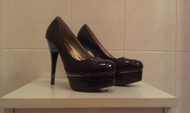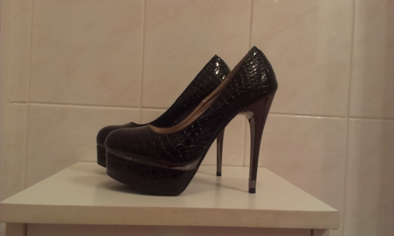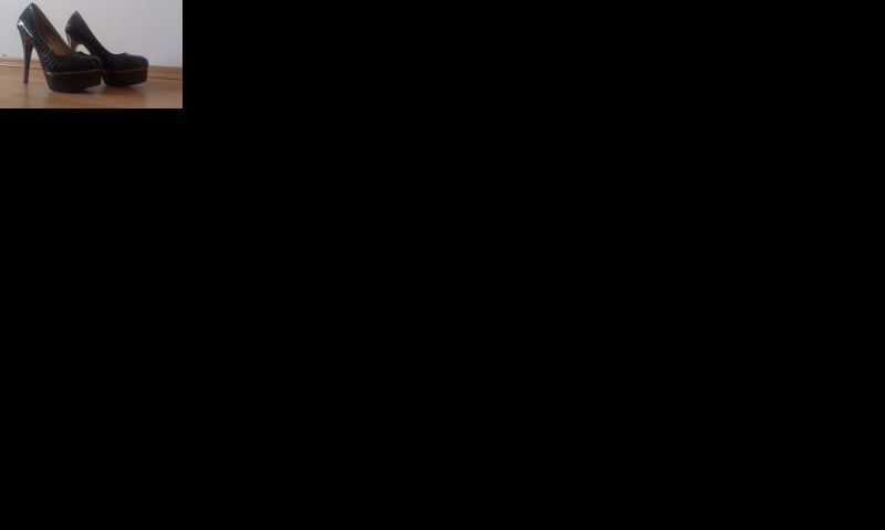 Krásné vysoké podpatky. Černé lesklé jakoby s hadím/krokodýlím motivem a lesklým podpatkem. Jsou nenošené, bohužel mi jsou malé.