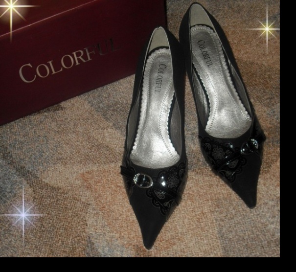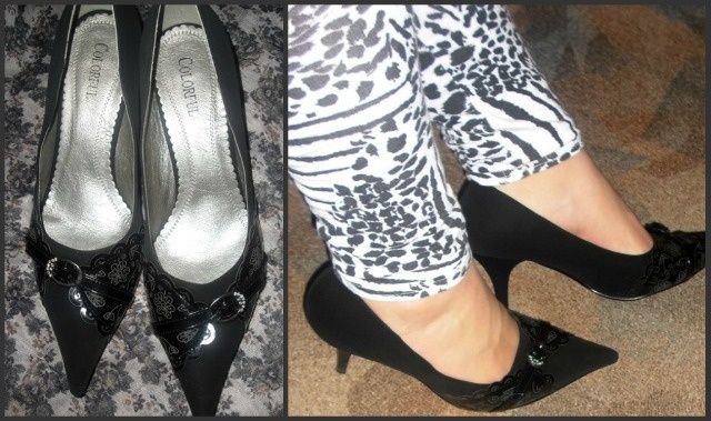 Černé semišové lodičky v kombinaci se zdobením koženky a bižu doplňky. Budou vhodné na plesy, společenské akce, i na běžné nošení. Jsou k nim i náhradní podpatky.