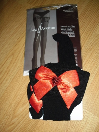 V originálním balení. Hladké černé punčochy s čevenou saténovou mašlí. 100% Polyamid.