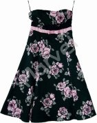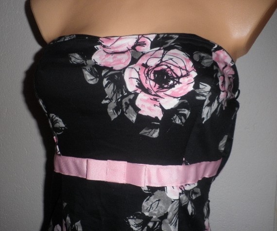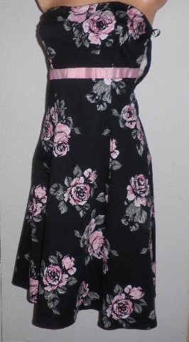 Nádherné šaty s květinovými vzory bez ramínek. Šaty jsou elastické, pod prsy mají lesklou růžovou stužku, vhodné i do společnosti.