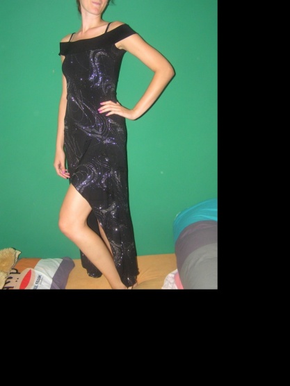 Krásné večerní šaty, černé se stříbrnými třpytkami. Lodičkový výstřih, hezky tvarují postavu. Velikost krásně bude Mku vyšší postavy. Rozměry : délka 132 cm, délka k rozparku 77cm, přes prsa 2x 35 cm, pas 2x 33 cm, boky 2x 37 cm (materiál je dost pružný ) Šatky jsou v top stavu méně