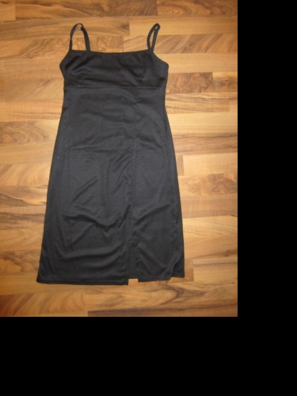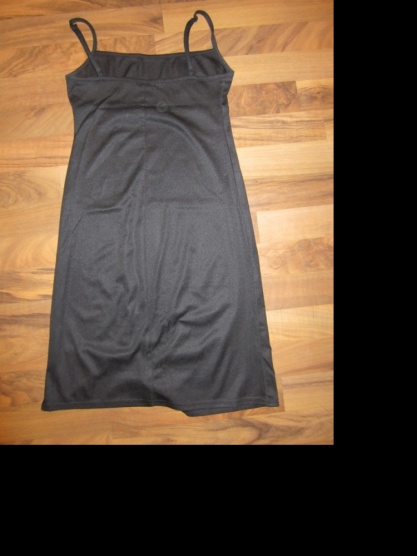 Černé upnuté ramínkové šaty, délka do půli stehen, materiál tenký, jemný, splývavý a neprůhledný. Velikostí spíše pro postavu XS.