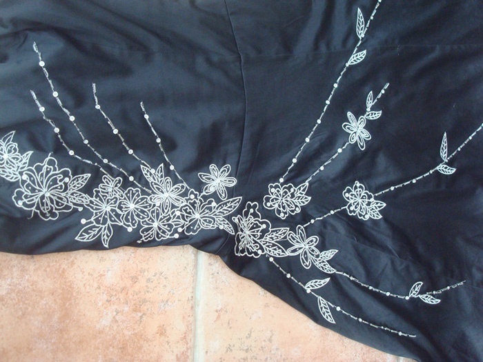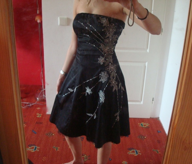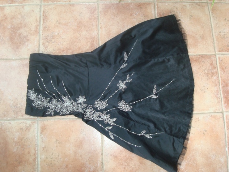 Prodám tyto černé šaty. Vepředu ze strany je aplikace vyšitá stříbrnou nití doplněná korálky s flitry. viz. fotky.