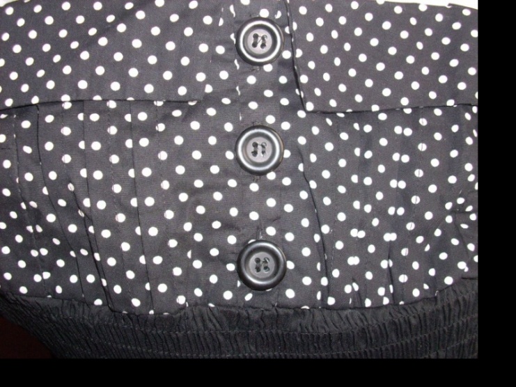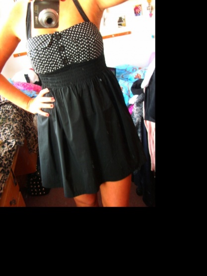 Prodám nenošené čérné šaty s puntíky a knoflíčky na hrudníku, s vázáním kolem krku. Velikost uvedena S, ale díky elastickému pásu umístěném pod prsy (kolem dokola) se šaty velmi přizpůsobí až na velkost L.