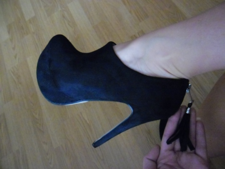 Zcela nové (ještě se samolepkami) nízké kozačky zakoupené v New Look. Velikost 38, ale já myslím že je vhodná pro vel. 37 s ponožkou, nebo pro vel. 38 se silonovou ponožkou (silonkami). Jsou moc krásné, ale neodvažuji se s nima vyrazit na ulici. Velice elegantní a stabilní obuv. Přes výšku podpatku i platformy jsou velice pohodlné. Zapínání v zadní části boty na zip, který je zdobený střapečkem.