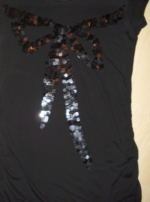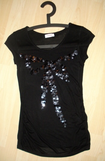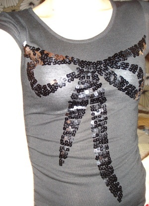Krásné černé tričko z velkou mašlí přes celý hrudník z našitých černých lesklých flitrů.