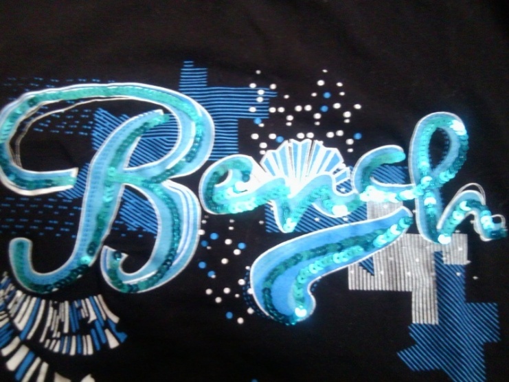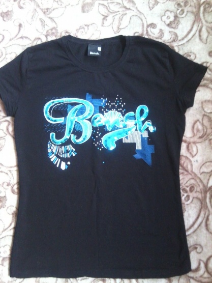 Tričko je pouze jednou vzaté, vepředu má modrý nápis s flitrů. Velikost S odpovídá.