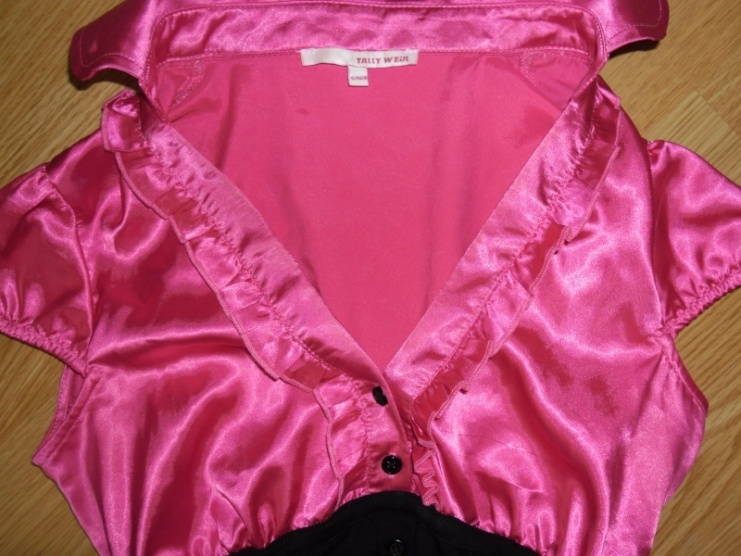 Párkrát nošená krásná halenka s krátkými rukávy Tally Weijl. Růžový vršek je ze saténového materiálu, zdobený kanýrkem a knoflíčky. Spodní černá část je korzetového střihu, opět zdobená knoflíčky. Vzadu zavazování na mašličku.