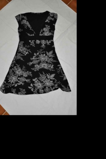 Černé šaty se vzorem bílých květů. Pro nižší postavy vhodné jako šaty, pro vyšší přes legíny. Véčkový výstřih, černý pruh pod prsy, velikost M/L. Rozměry - délka 84 cm, šířka pod prsy 37 cm. Jsou velmi elastické, nositelné i jako XL, nošené velmi málo. Cena 220,- + 20,- poštovné.