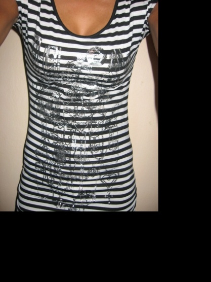 Prodám jednou vztaé delší pruhované tričko se stříbrným motivem, kupované v CA.