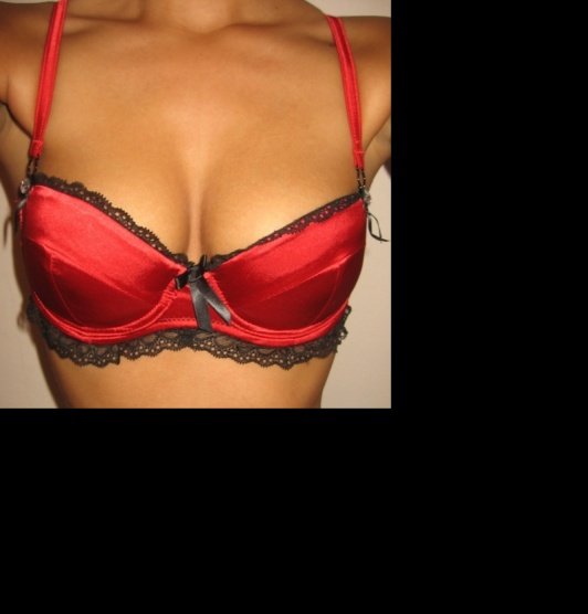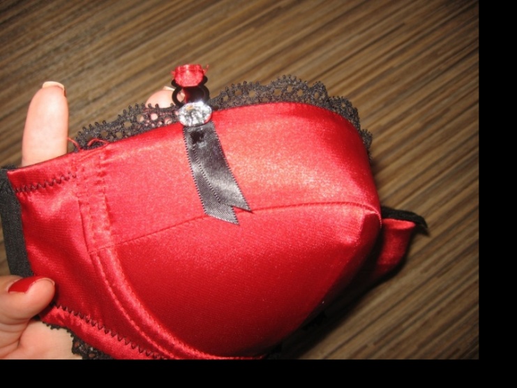Prodám novou nenošenou saténovou podprsenku v rudé barvě s černými detaily a kraječkou.