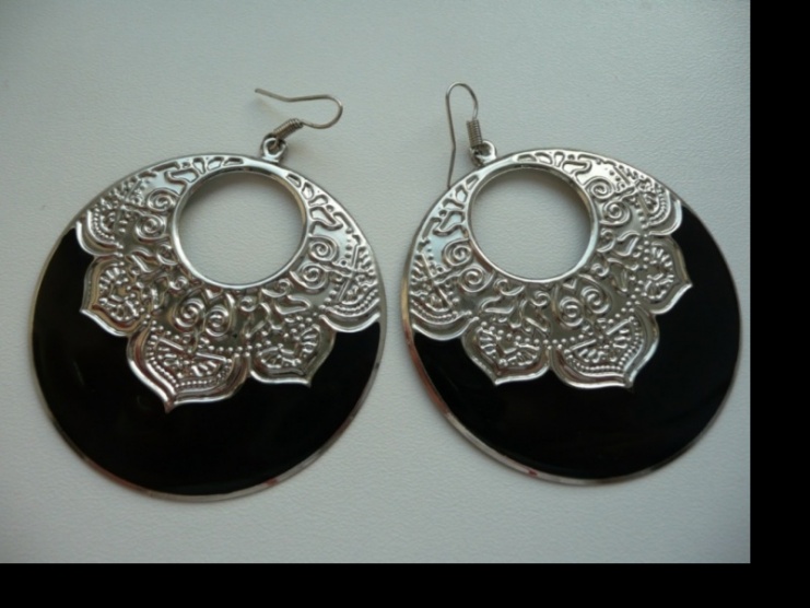 Prodám černostříbrné náušnice kola s ornamenty, viz foto. Rozměr 5,5cm v průměru. Jednou vzaté, jsou z HM.
