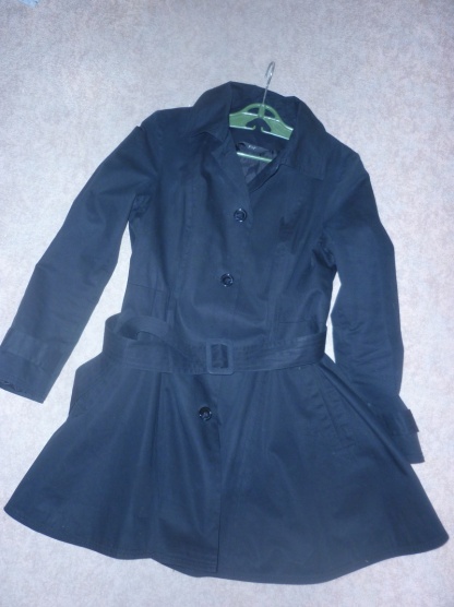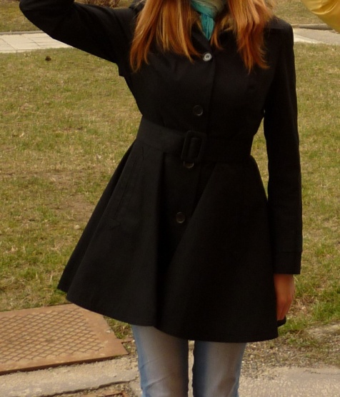 Prodám tento super delší kabátek na jaro v černé barvě. Dole rozšířený. Je na 4knoflíky a ještě lze libovolně utáhnout pásek - suprově podtrhuje ženské rysy.