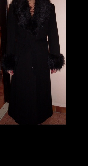 Prodávám mamince černý dlouhý kabát s chlupem okolo výstřihu, rukávů a v pase na zavazování. Měla ho na sobě snad maximálně dvakrát, takže je v naprosto perfektním stavu.