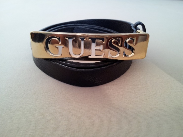 Tenký černý kožený pásek zn.Guess.Velikost spony 9x2cm.Mezi písmeny U a E je malý škrábanec.