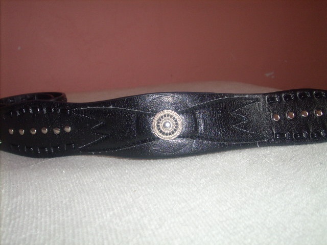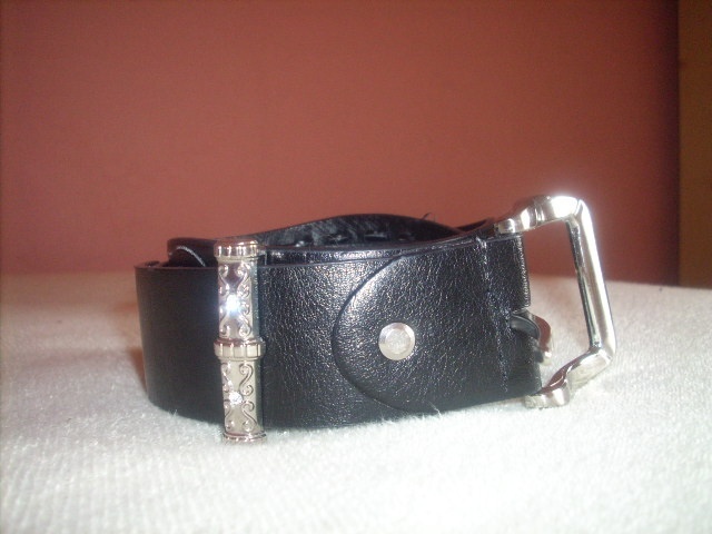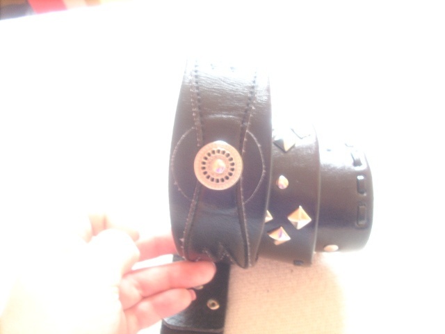 Černý, kožený pásek s ozdobami. Je mi bohužel krátký, jinak bych ho nedala. Dá se nosit jak v kalhotách, tak i na tunice, košili, tričku...
