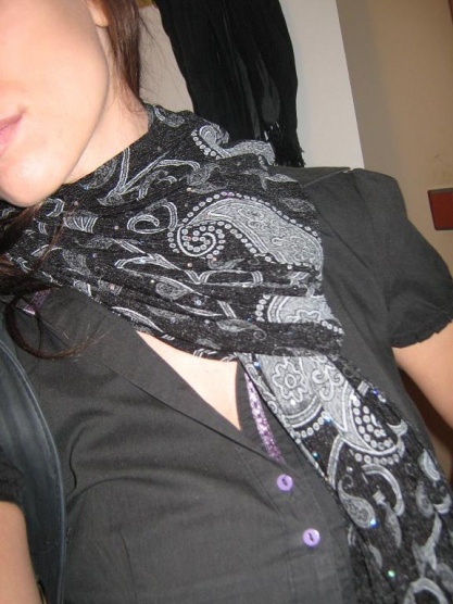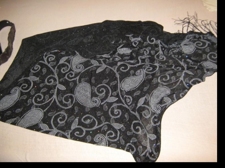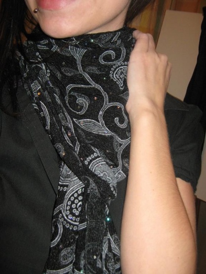 Nabízím tento šátek,který na krku vypadá opravdu moc hezky. Šátek má barvu černou,ornamenty jsou šedo-bílé a po šátku jsou rozprostřeny drobné kamínky,které sem tam házejí třpyt