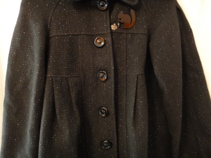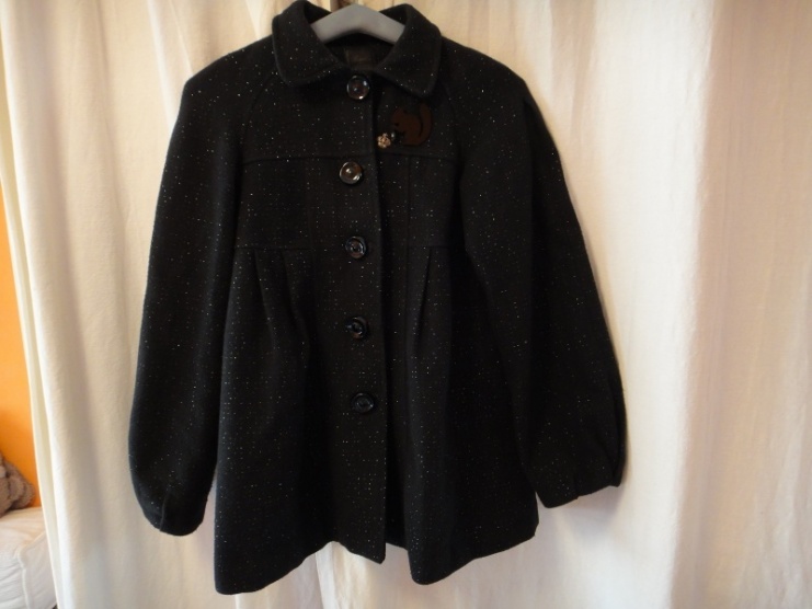 Kabátek je na zapínání s velkými knoflíky. Hodí se k šatům i kalhotám. Stříbrné prošívání je velmi efektní.