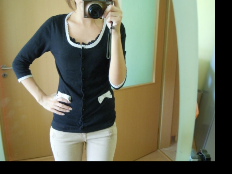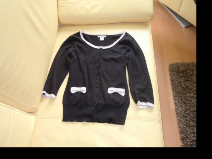 Prodám tento krásný svetřík z H&M, měla jsem ho pouze jednou. Černý svetřík oživí mašličky. Moc hezky vypadá jak zapnutý tak rozepnutý.