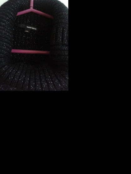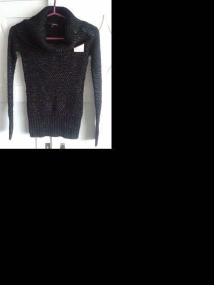 1Krásný černý uplý svetřík TW, úplně nový s cedulkou, má v sobě zapletené stříbrné nitky a na límci 3knoflíky