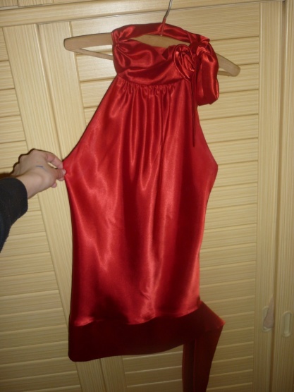 Prodám rudě červenou saténovou halenku bez rukávů. Na krku a na spodu zavazování na mašličku. U krku růže. Na sobě jsem ji měla asi 2x. Cena 150Kč, případně výměna.