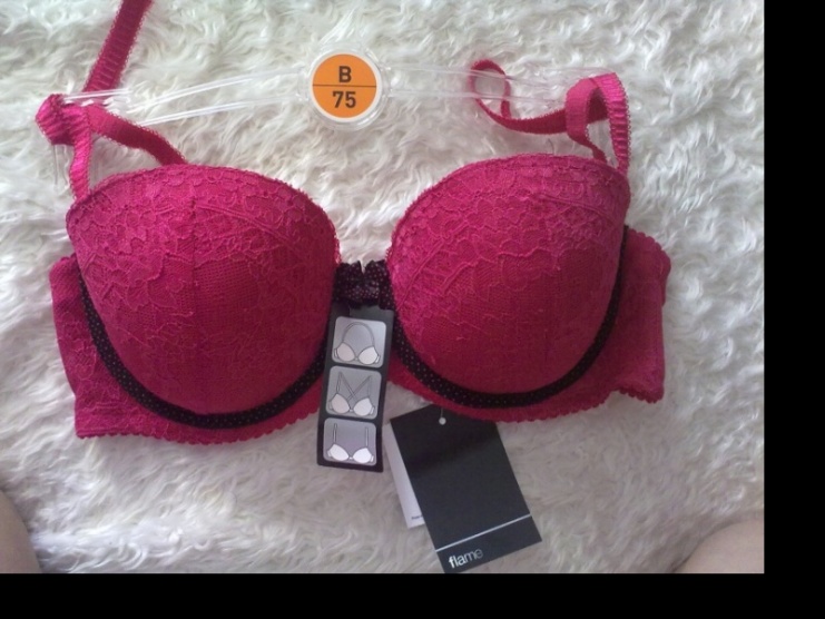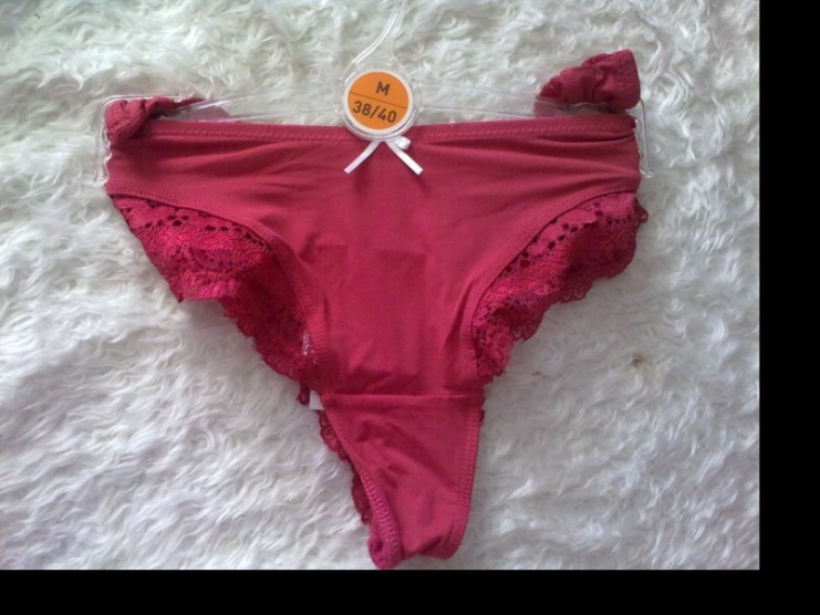 Spodní prádlo bylo zakoupené minulý týden, ale rozhodla jsem se ho prodat, protože po vyzkoušení se mi na mě nelíbilo. Je ale moc krásné, v obchodě jsem si ho vybrala na první pohled. Podprsenka není červená, ale krásně malinová, kalhotky jsou červené. K podprsence stejnou barvu kalhotek nemeli. Podprsenka je vyztužená, hezky tvaruje poprsí, potažená krajkou.