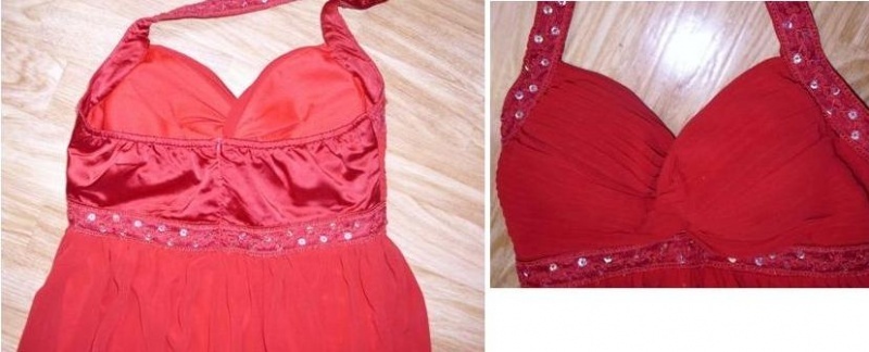Šaty mají spodničku z velice příjemného materiálu, v zadu zapínání na zip, s ramínky kolem krku, ale jednoduše je můžete připnout v zadu, a budou na každém rameni zvlášť. Lze je také vzít bez ramínek(zastrčíte je dovnitř) - dobře to drží a je to velmi elegantní. Ramínka a pruh pod prsy jsou zdobené flitry, korálky a výšivkou. Zadní část je z pružného saténu - nemusíte se bát že se nepřipůsobí vaší velikosti. Košíčky vyztužené- lze nosit s podprsenkou i bez.