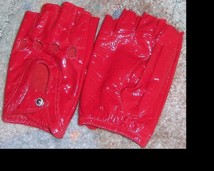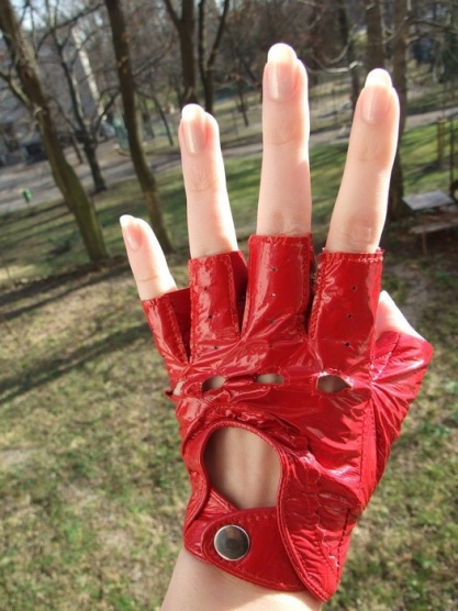 Lesklé bezprsté rukavice z jemné kůže, málo nošené. Velikost je na nich psána XXL, ale neodpovídá, ačkoli nevím jak se měří velikost rukou