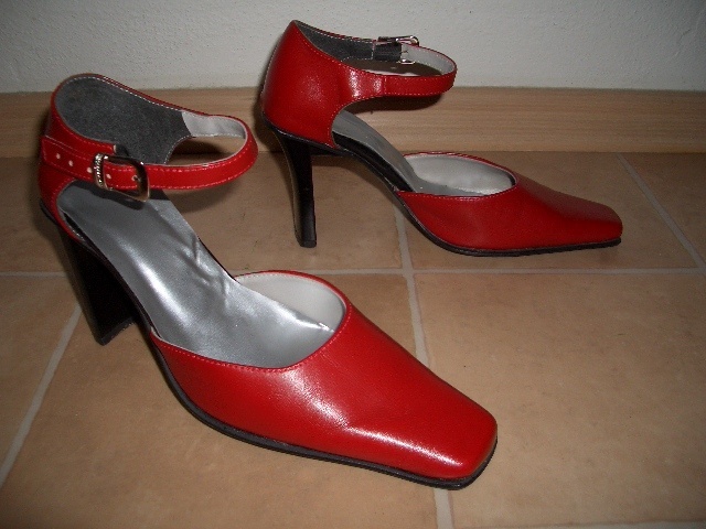 červené lodičky na 9cm podpatku, který je při bočním náhledu úzký a při pohledu zezadu široký. Jsou nošené, ale na střídašku s jinými červenými, kterých mám v botníku nejvíce a nejsou okopané, ani není nutno podrážet. Nejsou kožené. 360 vč. pojištěné pošty