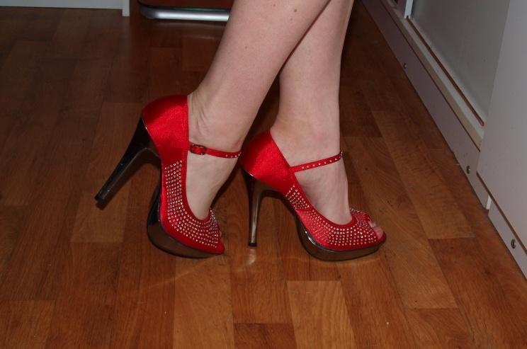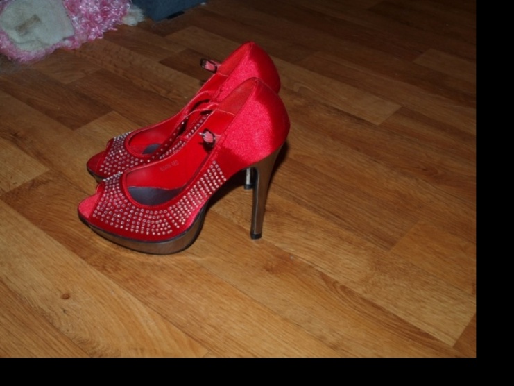 Lodičky jsou zdobené třpytivými kamínky, přes nárt je červený pásek, stříbrný podpatek + platforma