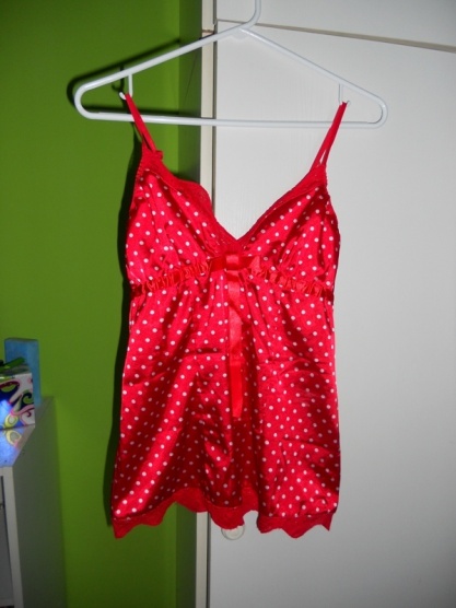 Nabízím červené saténové tílko s bílými puntíky zakoupené loni v New yorkeru, měla jsem ho jen na dovolené. 200 včetně pošty.