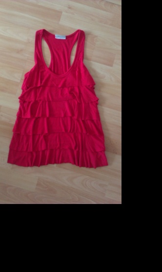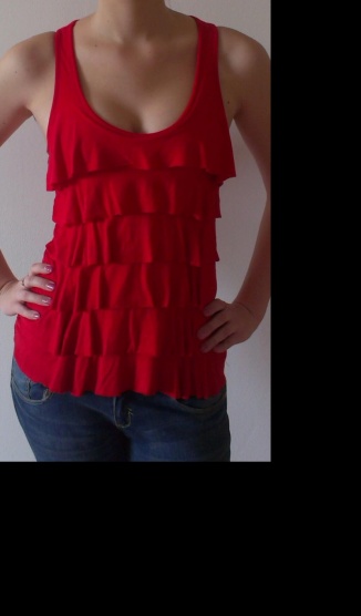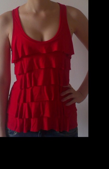 Hezké, sytě červené tílko s volánky značky Clockhouse. Barva odpovídá první a druhé fotce. Je nošené, ale nemá žádnou vadu, parádu ještě udělá Úsměv Já už ho nevynosím, ale je mi líto ho vyhodit, určitě ještě někomu udělá radost a dobře poslouží. Velikost může být M a klidně i L