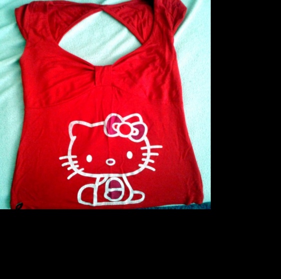 1Krásné tričko s obrázkem Hello Kitty, zakoupené v Itálii. Vepředu i vzadu vykrojené, což ho dělá velmi zajímavým. Velikost není udána, ale odpovídá XS - S.