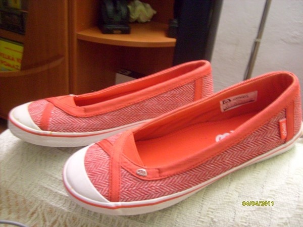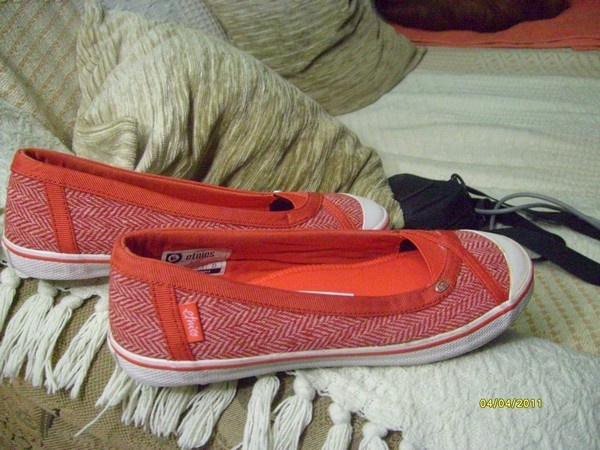 Nabízím úplně nové balerínky zn. Etnies. Mají červeno bílou barvu, jsou proužkované a moc pohodlné. Veliksot psaná 37,5, ale já nosím normálně 38 a jsou mi akorát. Důvod prodeje je barva, k ničemu se mi nehodí