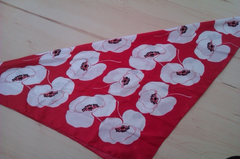 Prodám nový saténový šátek, červenobílý, s květy vlčích máků.