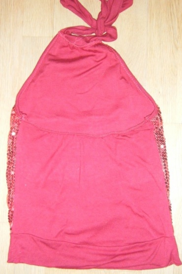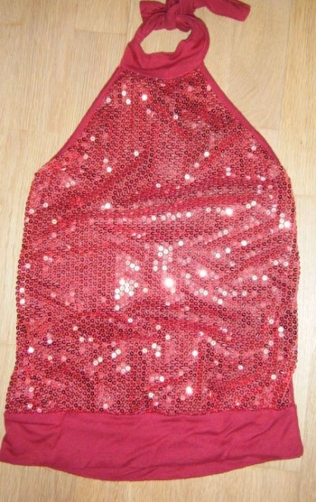 Až ke krku, na zavazování. Je elastický, celá přední strana poseta flitrami, spíše na disco.Prodám za 160kč včetně pošty.