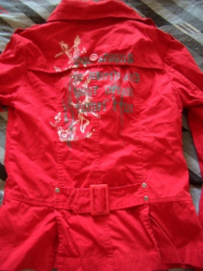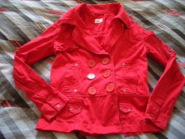 červené sako-kabátek, nošený naposledy na jaře, pak vypraný a uložený v úložném boxu, přežehlení si nechám již na nové majitelce. Již nosit nebudu. Bavlněný kepr, má spoustu super detailů, motiv na zádíčkách, vzadu stahování k projmutí. Velikost M, délka 63cm, od podpaží k podpaží 48cm. Nošení a praní je samozřejmě znát, není nový, ale nemá žádné díry ani fleky. 270 vč.pojištěné pošty