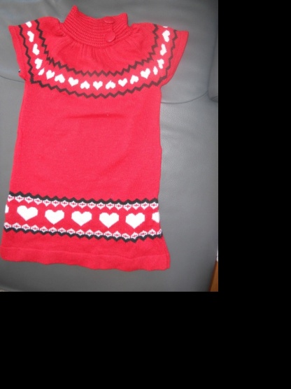 Velikost S, ale myslím, že oblékne bez problémů i M. Délka 72 cm, šířka 40 cm. Červené barvy s bílými srdíčky. U krku jsou 2 ozdobné knoflíky.