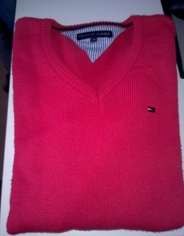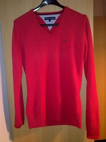 Prodám svetr Tommy Hilfiger. Výstřih do -V-. Barva červená. Nošený asi 3x - nepoškozený.\r\n\r\nešte upozornujem na zopár žmolkov čo povodna majitelka neuviedla ale ja pre poriadok uvádzam su hlavne na rukávoch asi od stola.... farba je jasne červená foto presvetlená bleskom