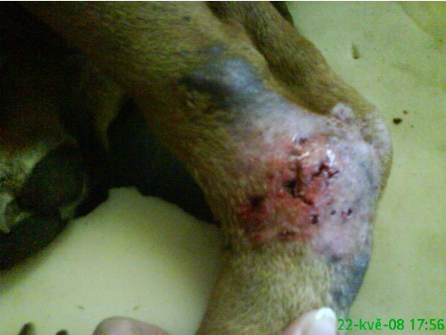Mishaa, na té zadní noze žádný otlak neměl, někde se prostě poranil asi o růže nebo něco a začlo mu to hnisat. Pak se mu tam vytvořila taková jakoby měkká boule. Léčili to asi 3 měsíce ATB a pak to vyoperovali. Rok se mu to hojilo a zahojil až letos v létě. No a teďka se mu to udělalo na přední noze v místě toho otlaku. Byla jsem i u vojenského vet. jezdí tady psovodi z celé republiky a ten taky nevěděl, co to je. Prý chronický zánět kůže ...